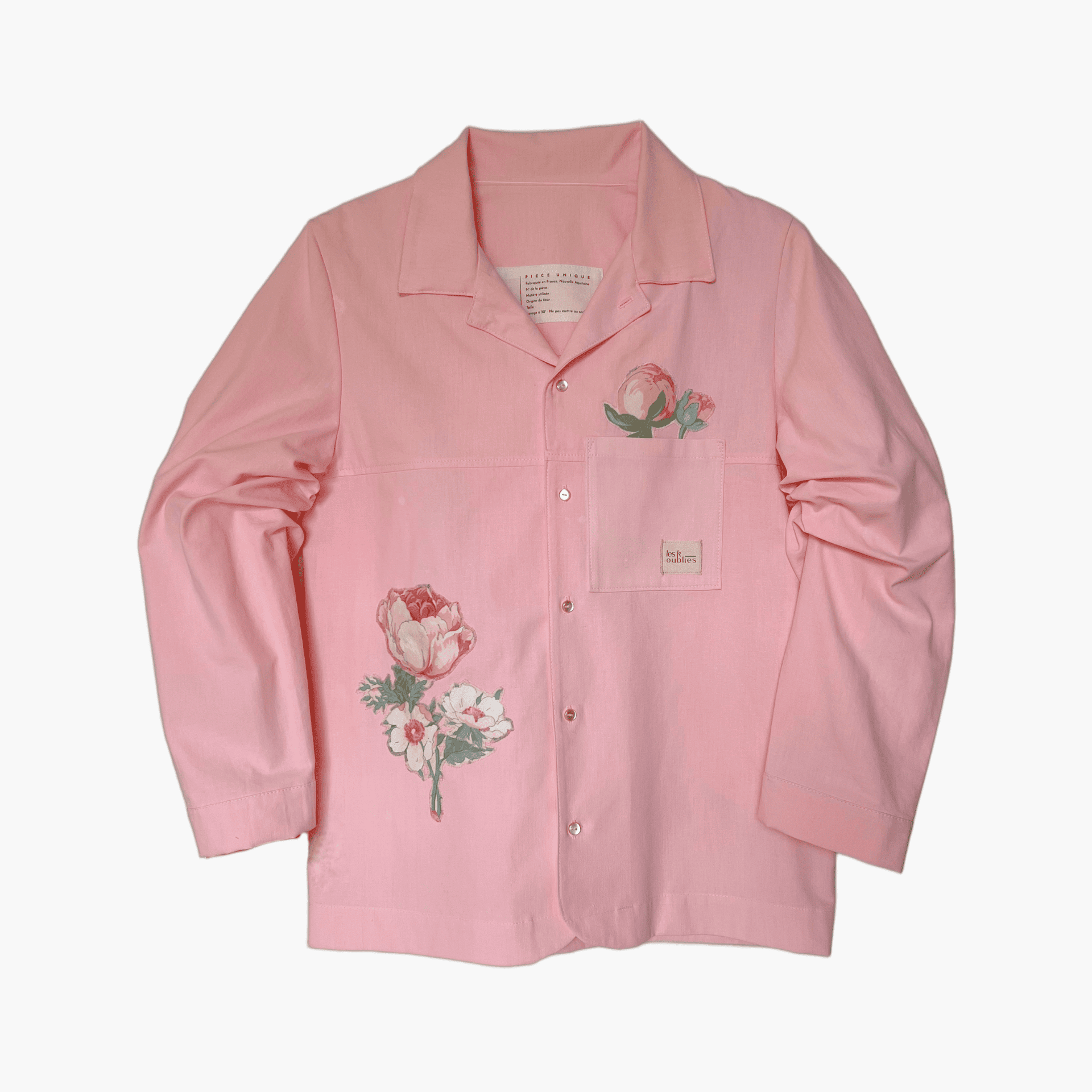 La pièce iconique PAULA arbore un col cubain et son indissociable poche plaquée. Le modèle 11.10 sur lequel se pose des incrustations de chutes de tissus, pour reprendre l’esthétique d’un herbier. L’incrustation florale apporte un décalage visuel avec ses finitions brutes et effilochées, qui se peaufineront au fur et à mesure du temps.