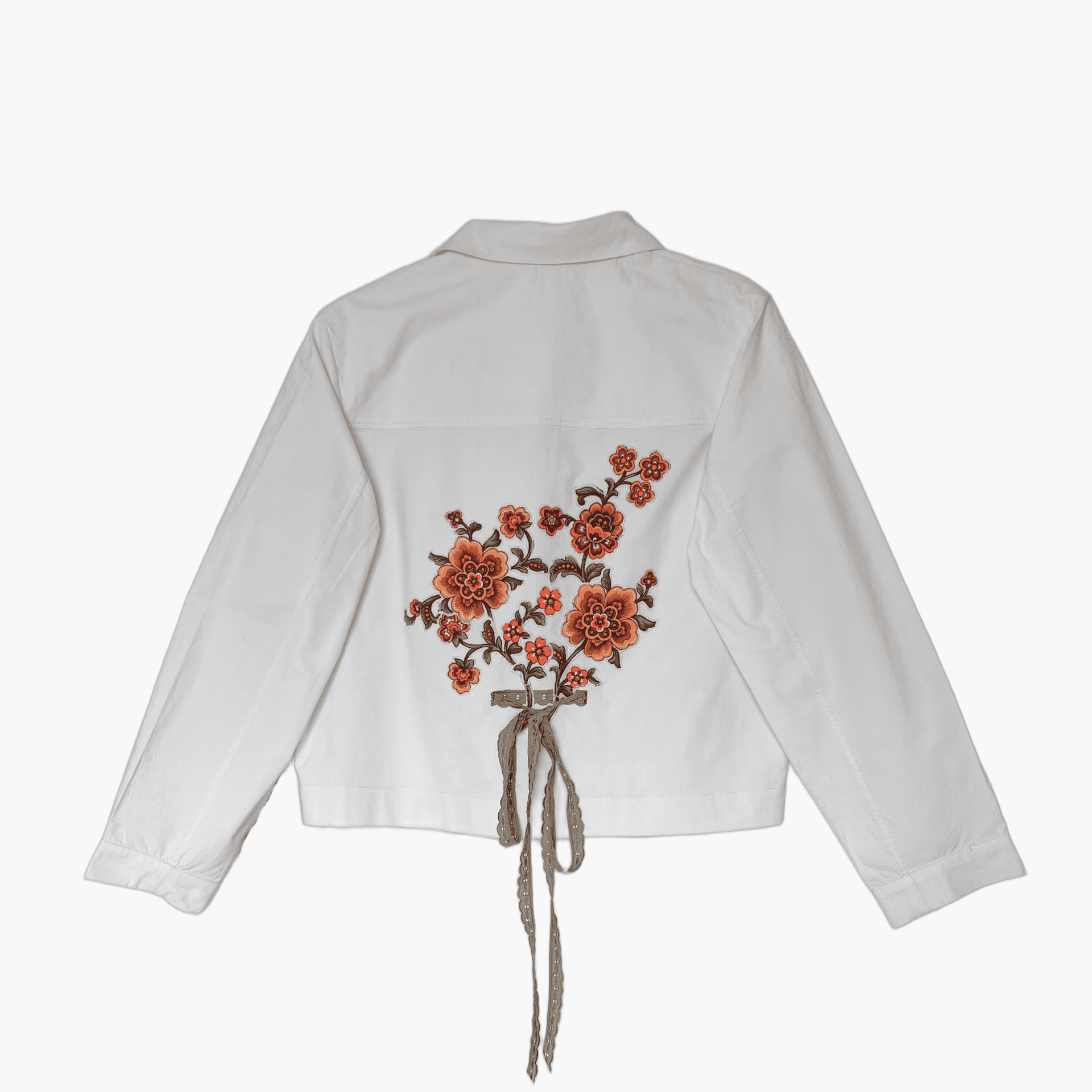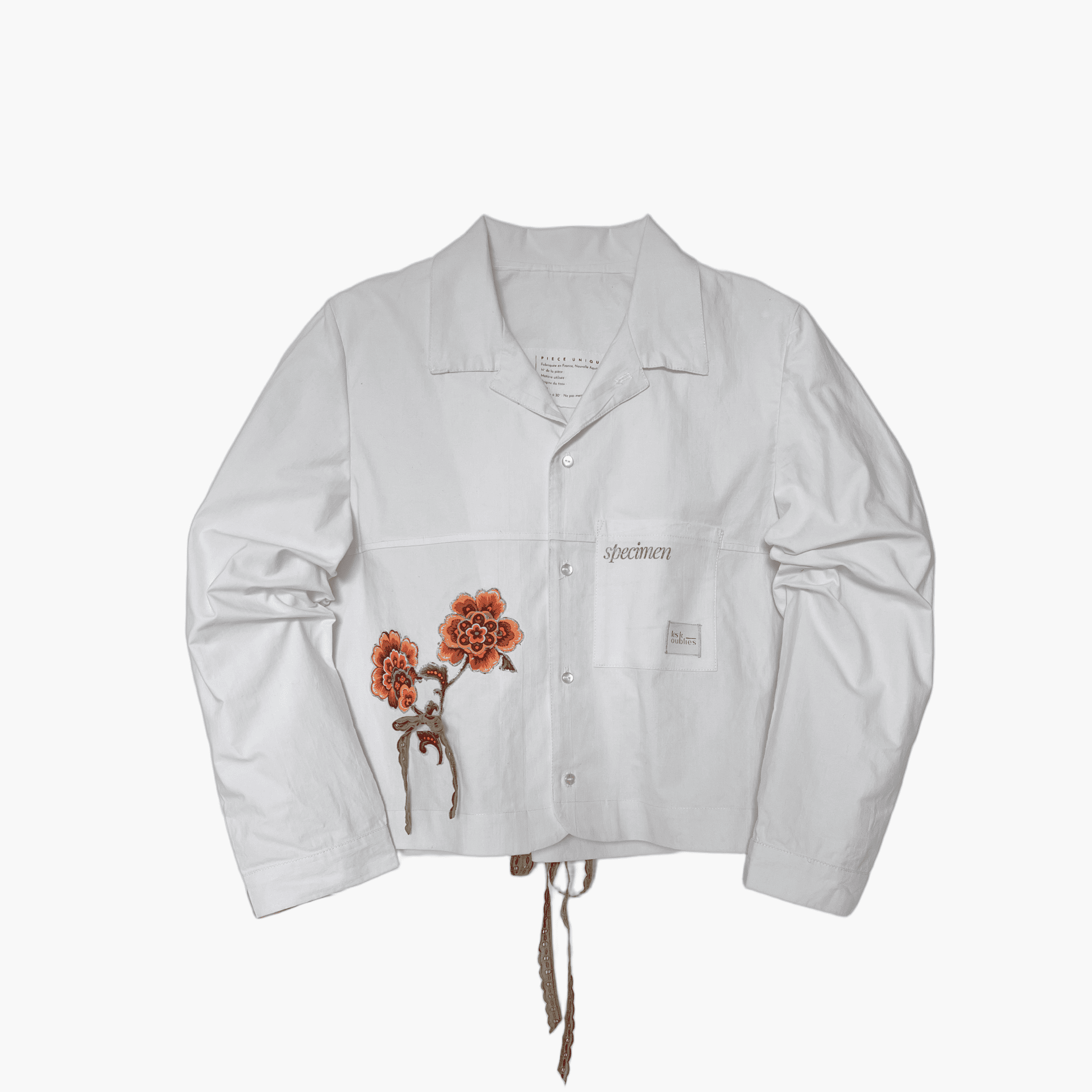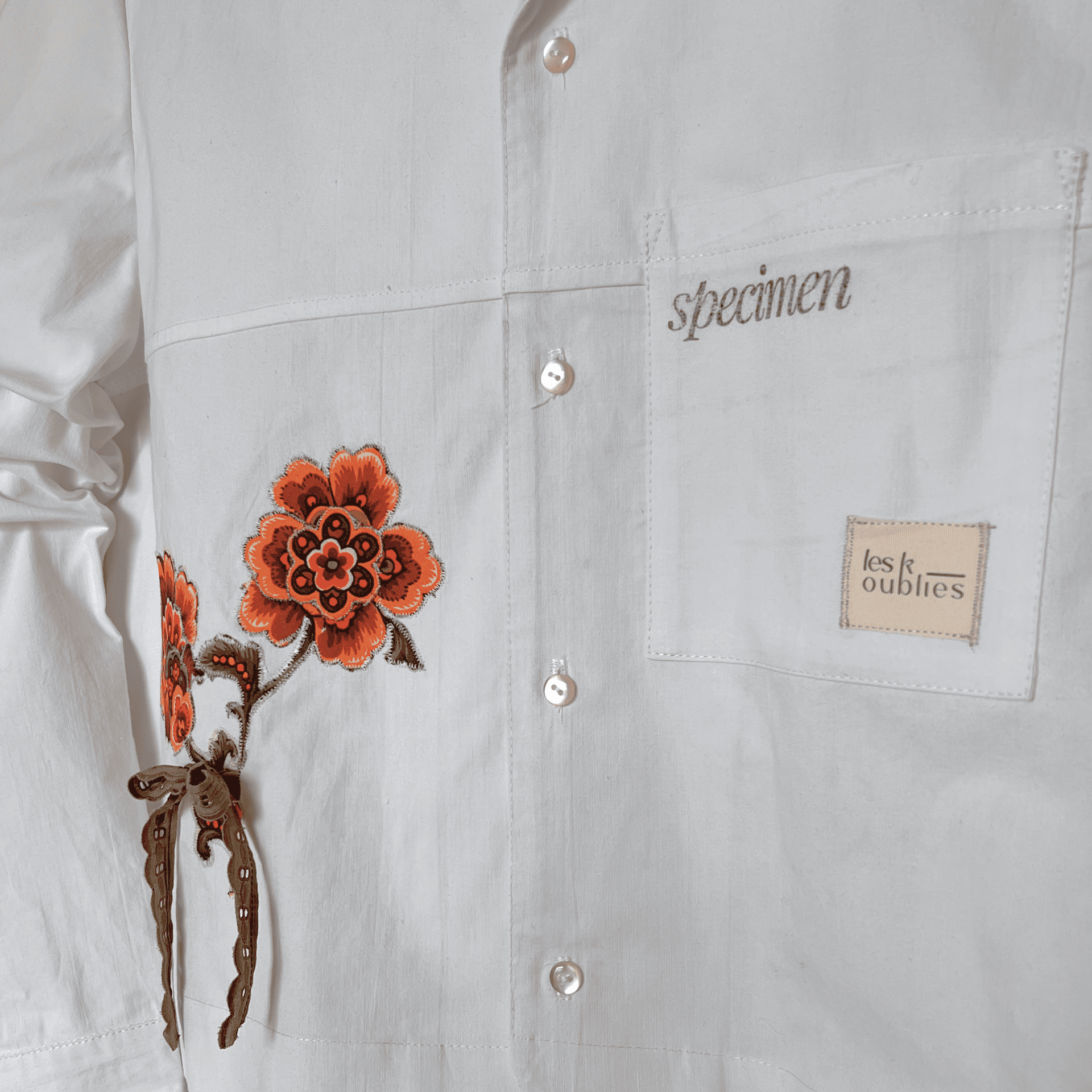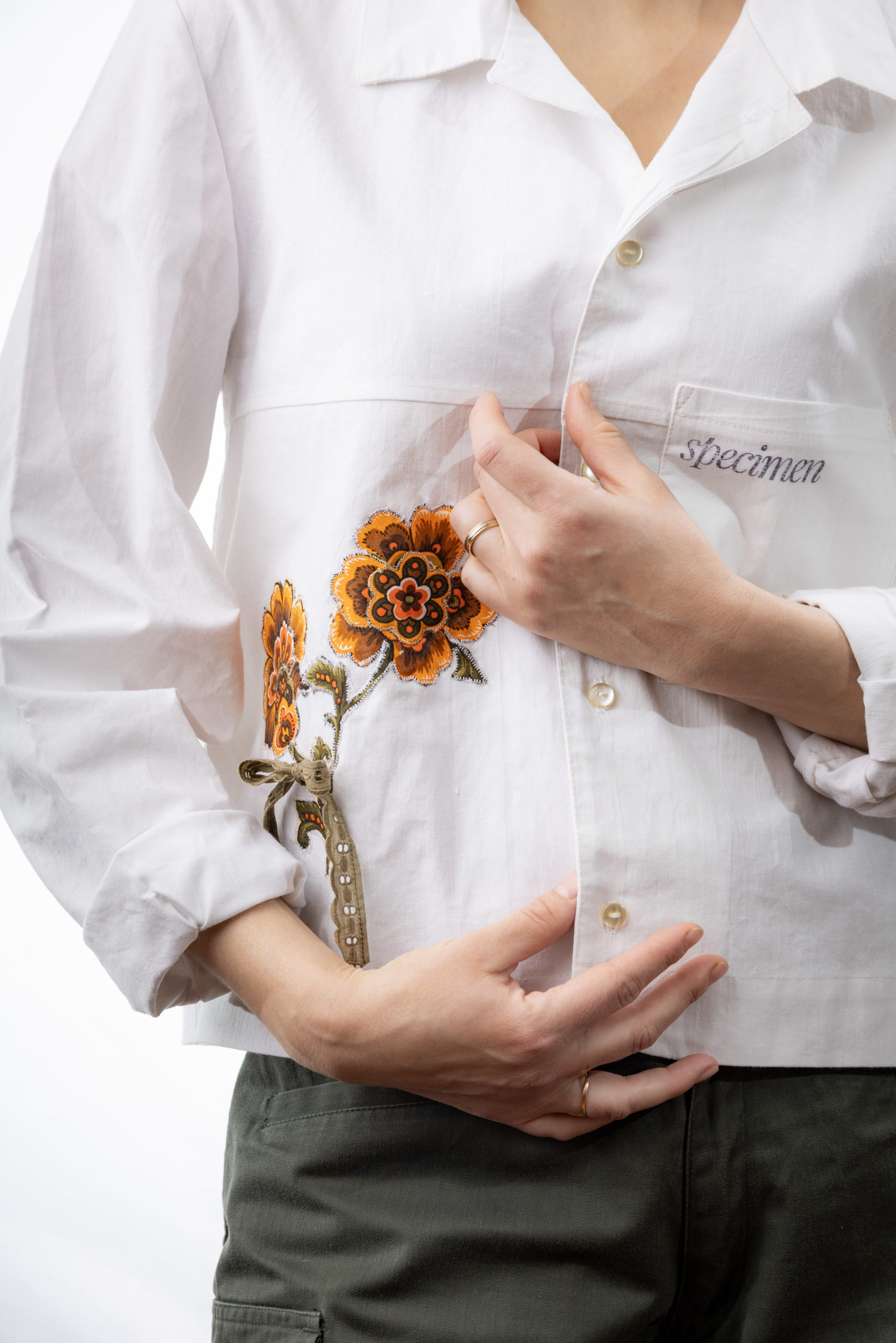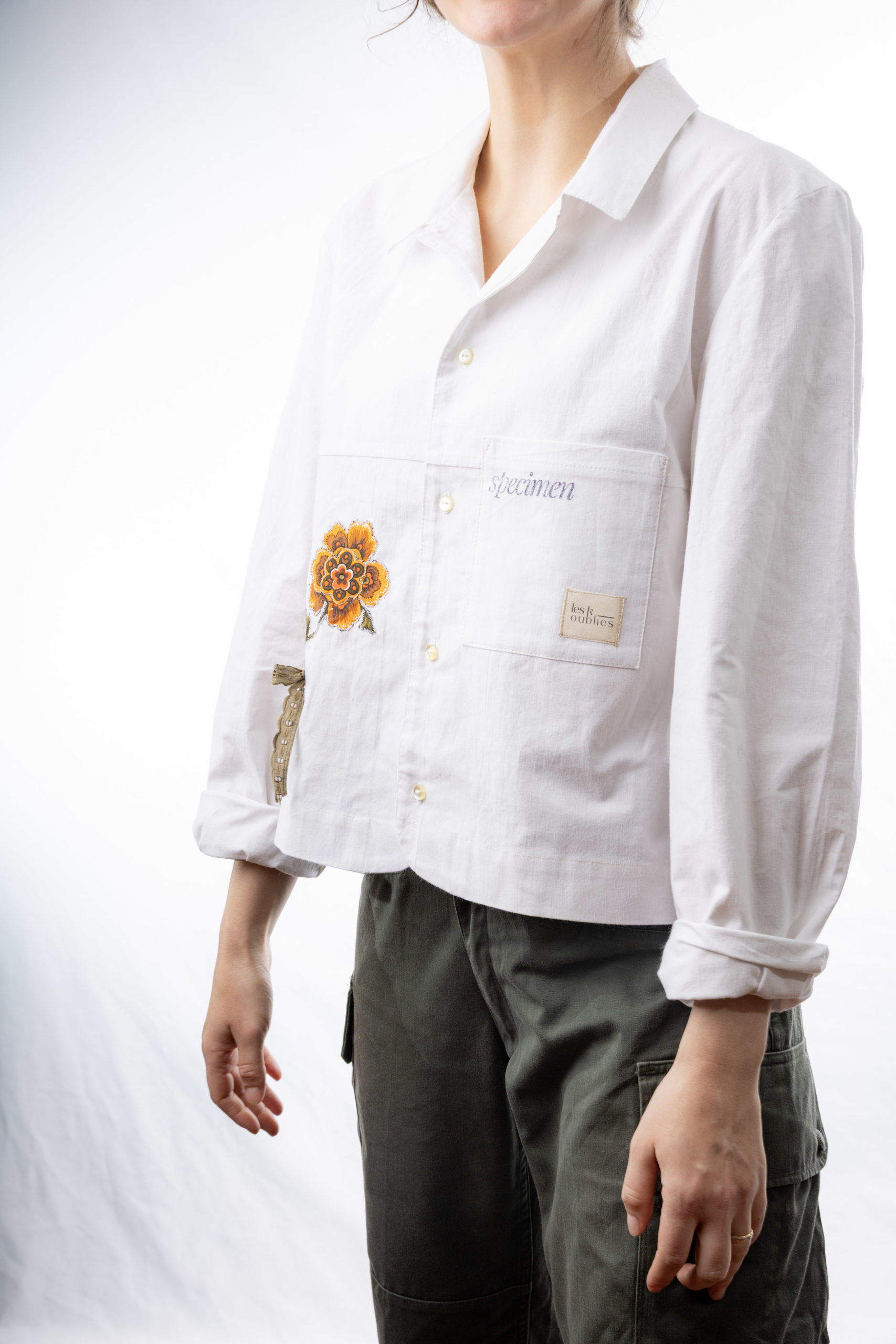 La surchemise PAULA 11.2, version crop se décline dans les couleurs de la collection SPECIMEN. Marquée pour célébrer l’unicité de chaque fleur qui ont déjà sublimé des pièces antérieures, aujourd’hui ces mêmes fragments se « réinventent » dans l’esthétique propre à l’herbier.