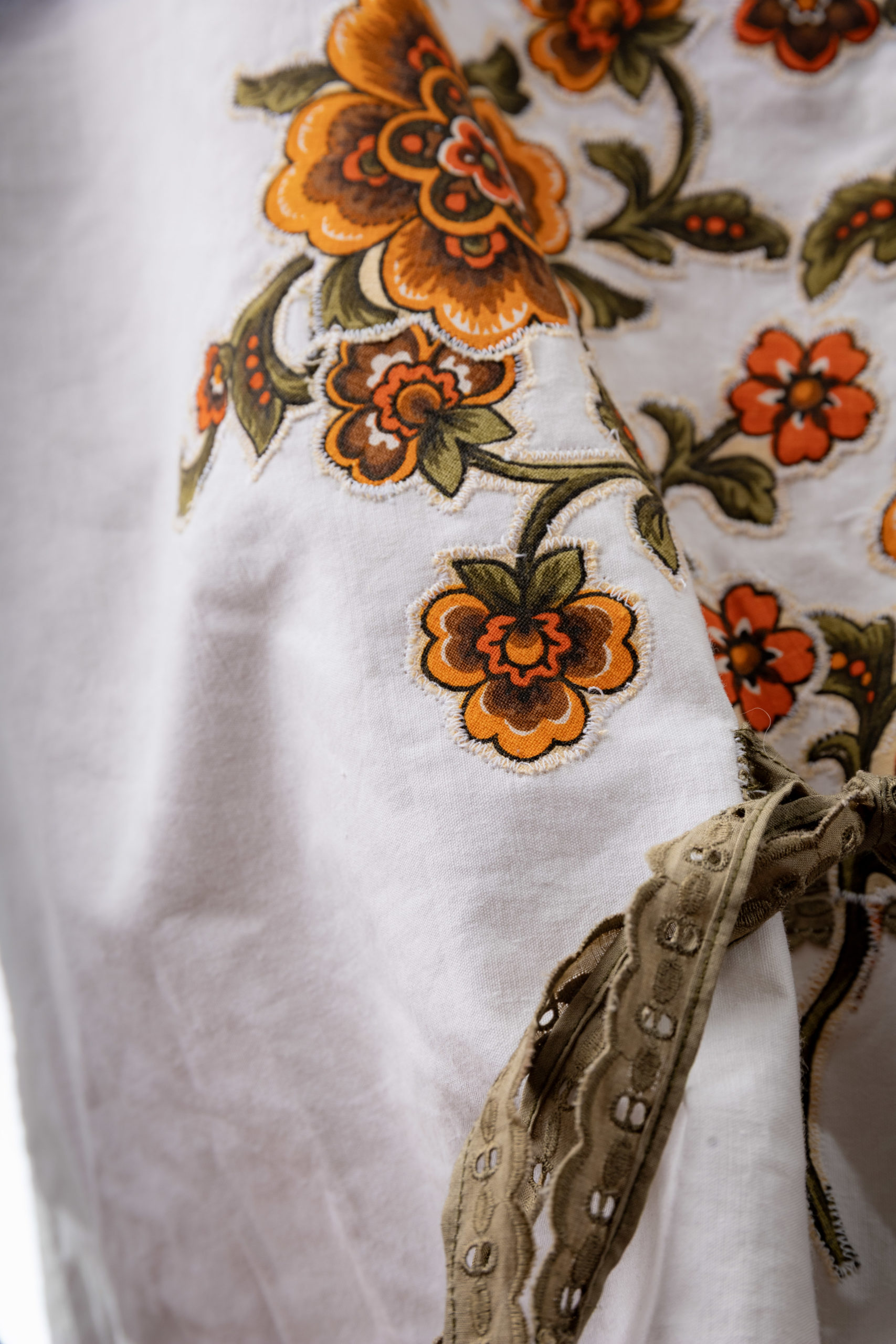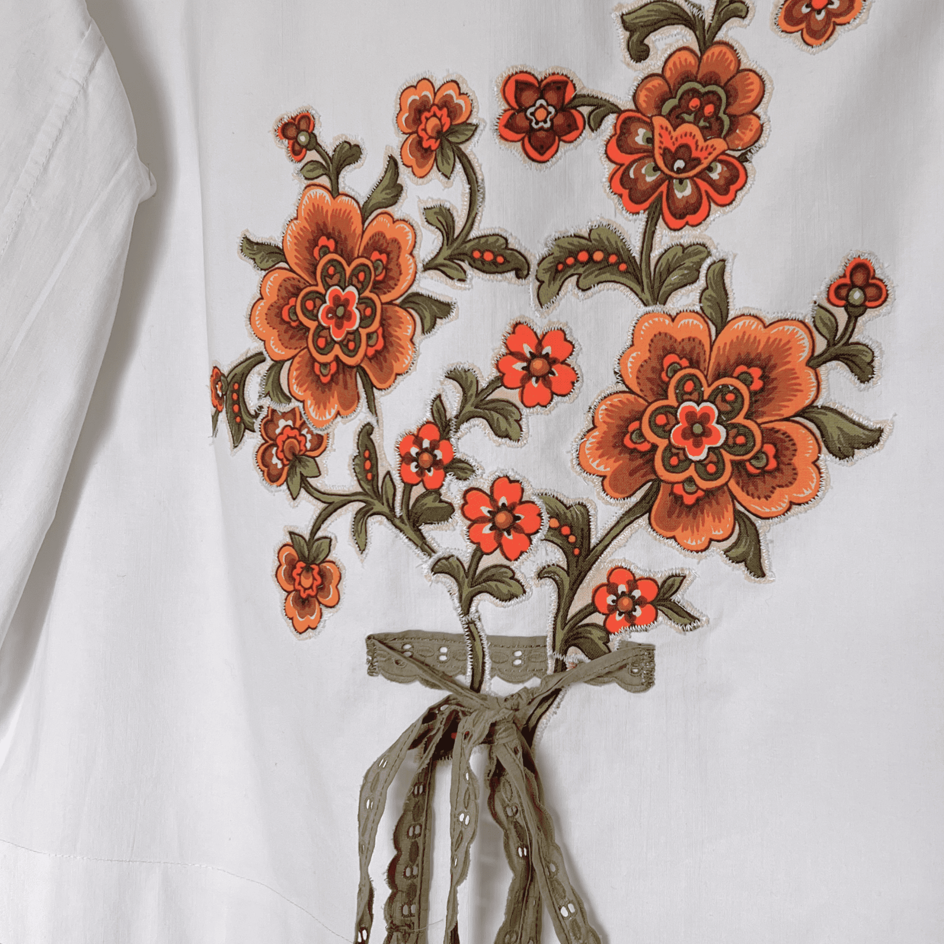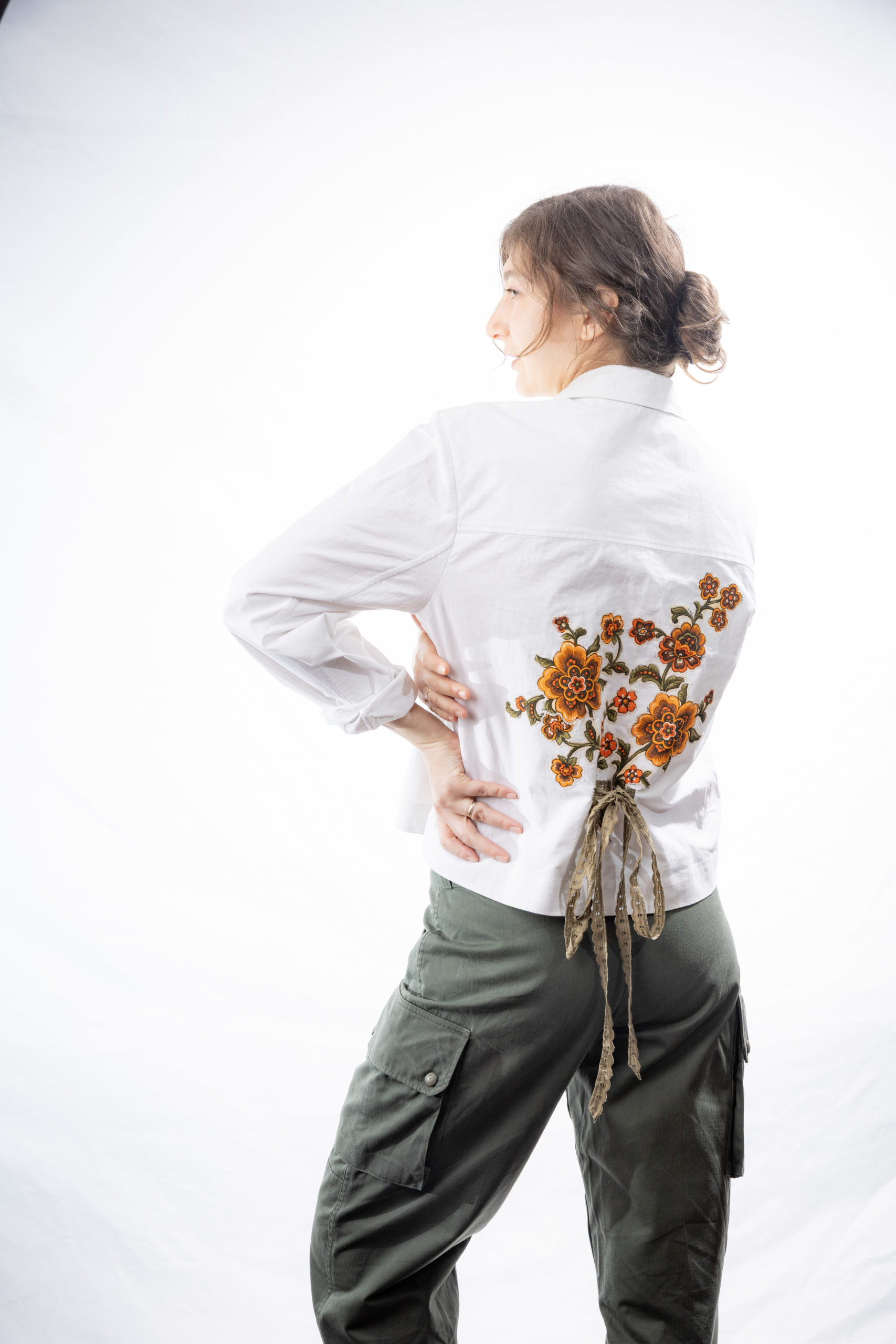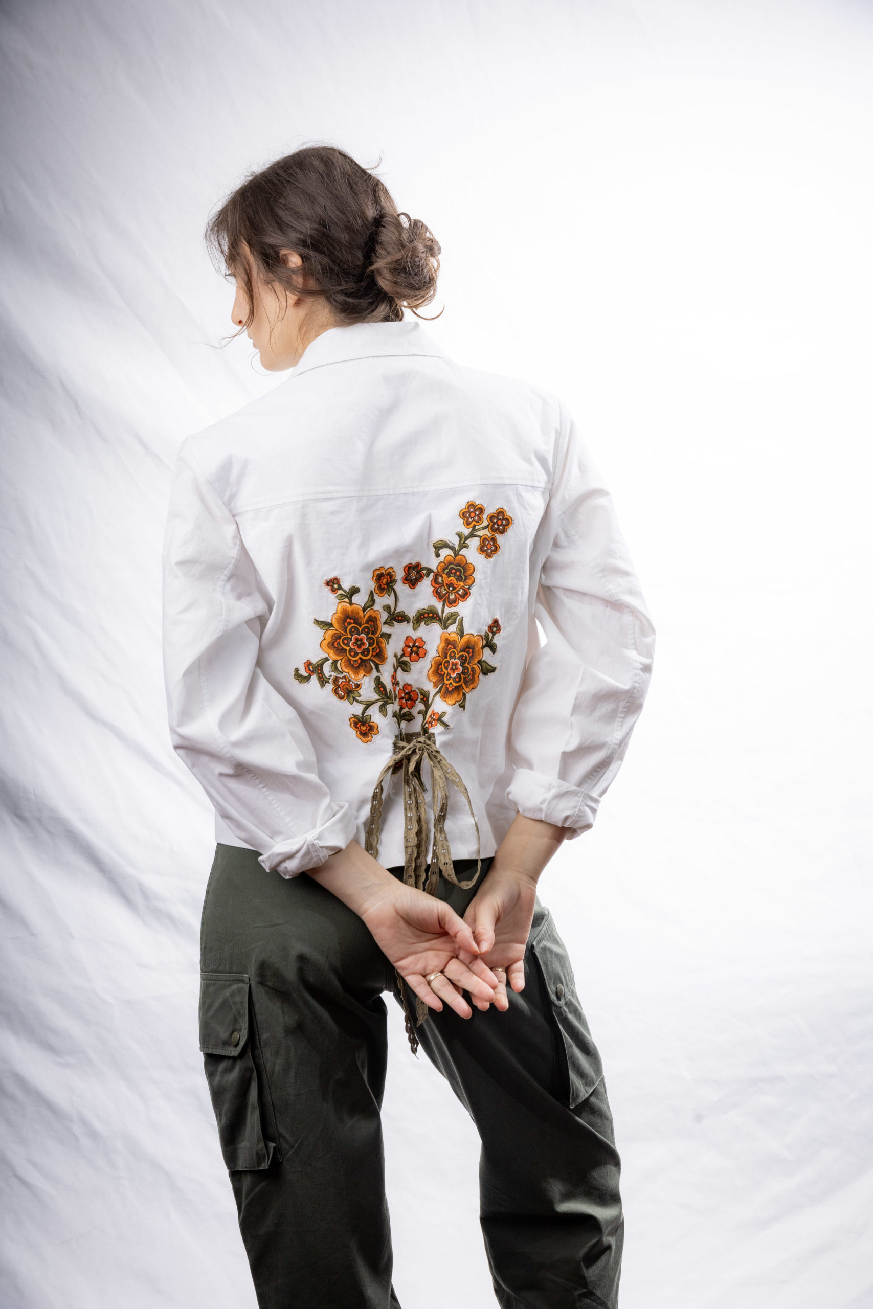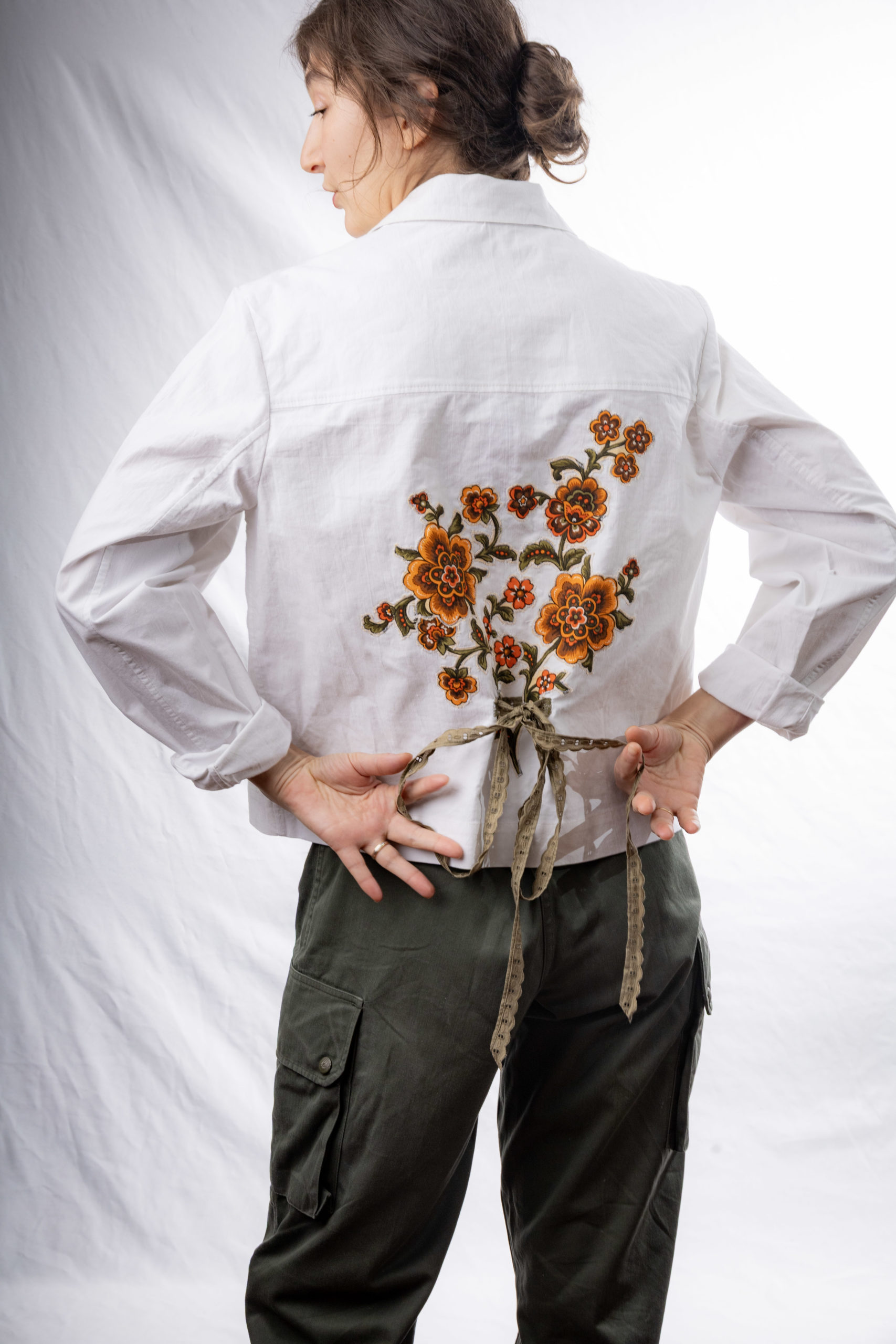 La pièce iconique PAULA arbore un col cubain et son indissociable poche plaquée. Le modèle 11.2 a été pensé comme un véritable bouquet de fleurs à porter sur soi-même : un premier petit bouquet sur le devant, arboré d’un lien en broderie anglaise kaki, et un plus grand dans le dos, qui peut être cintré pour donner encore plus de volume à la pièce.