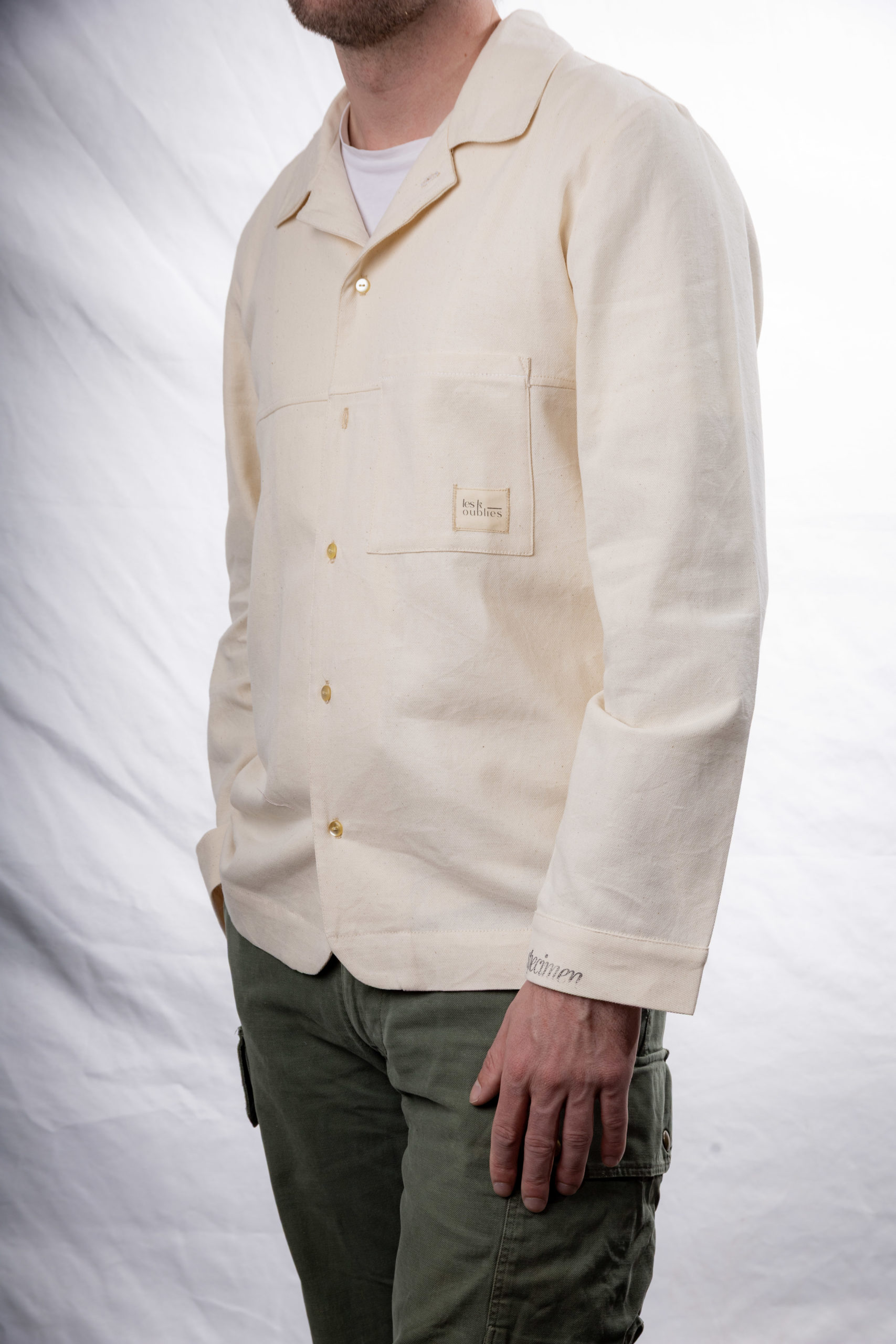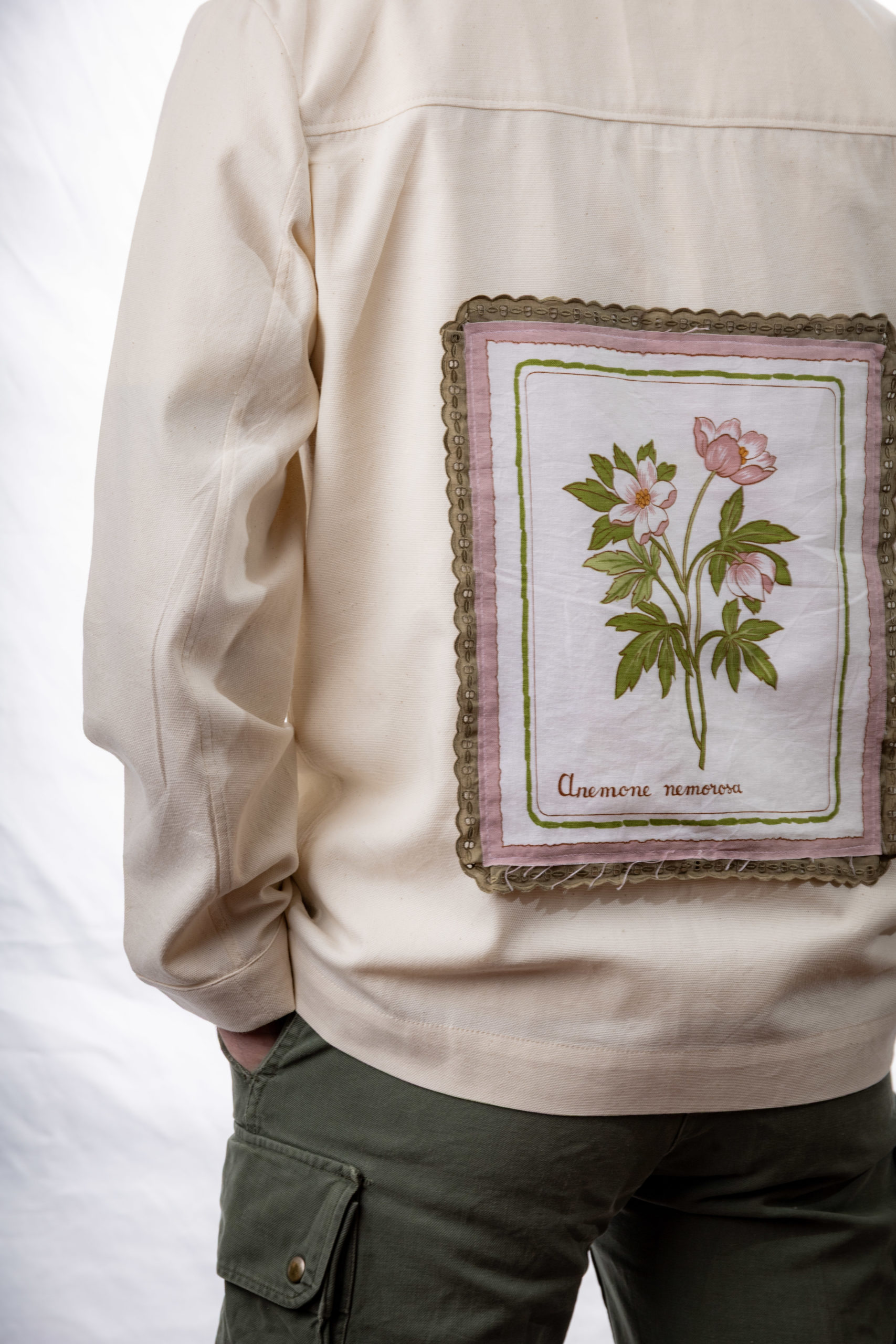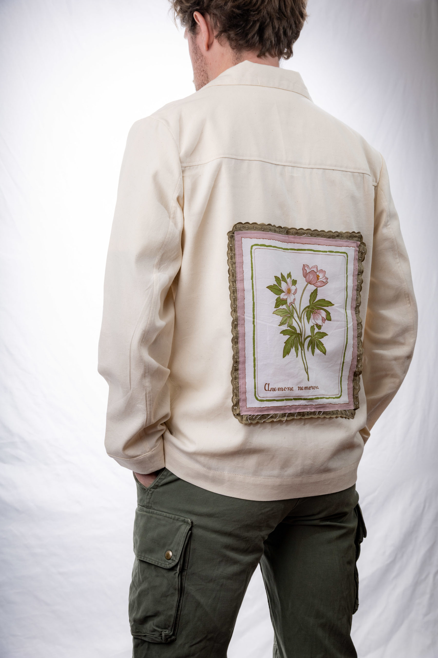 La pièce iconique PAULA arbore un col cubain et son indissociable poche plaquée. Le modèle 11.5 se joue d’un tissu aux motifs de l’herbier et de superpositions de matières, recréant un mini-cadre en broderie anglaise kaki, lui donnant un air romantique et printanier. L’incrustation florale apporte un décalage visuel avec ses finitions brutes et effilochées, qui se peaufineront au fur et à mesure du temps.