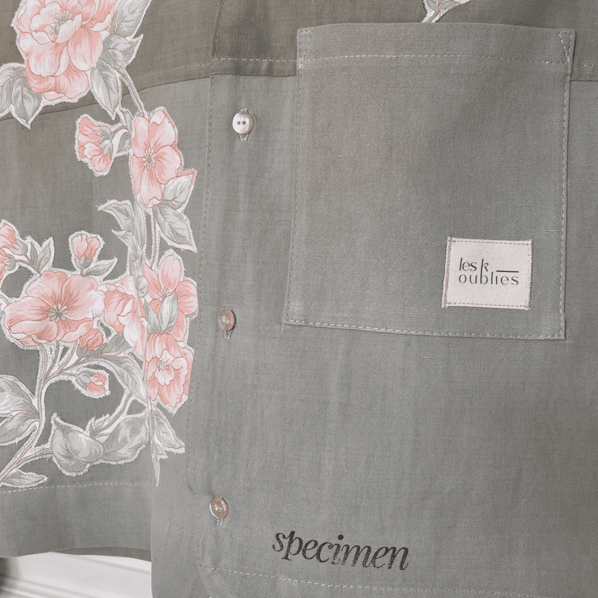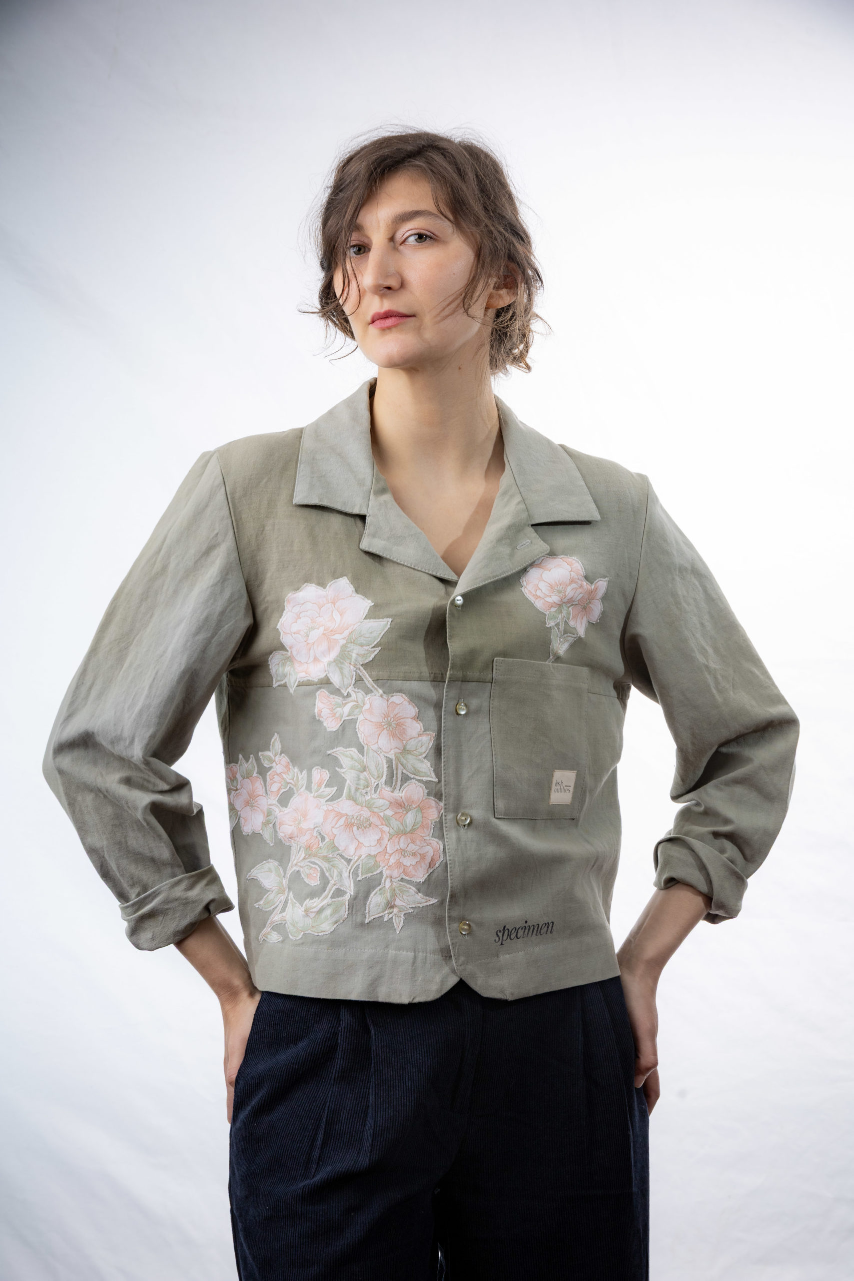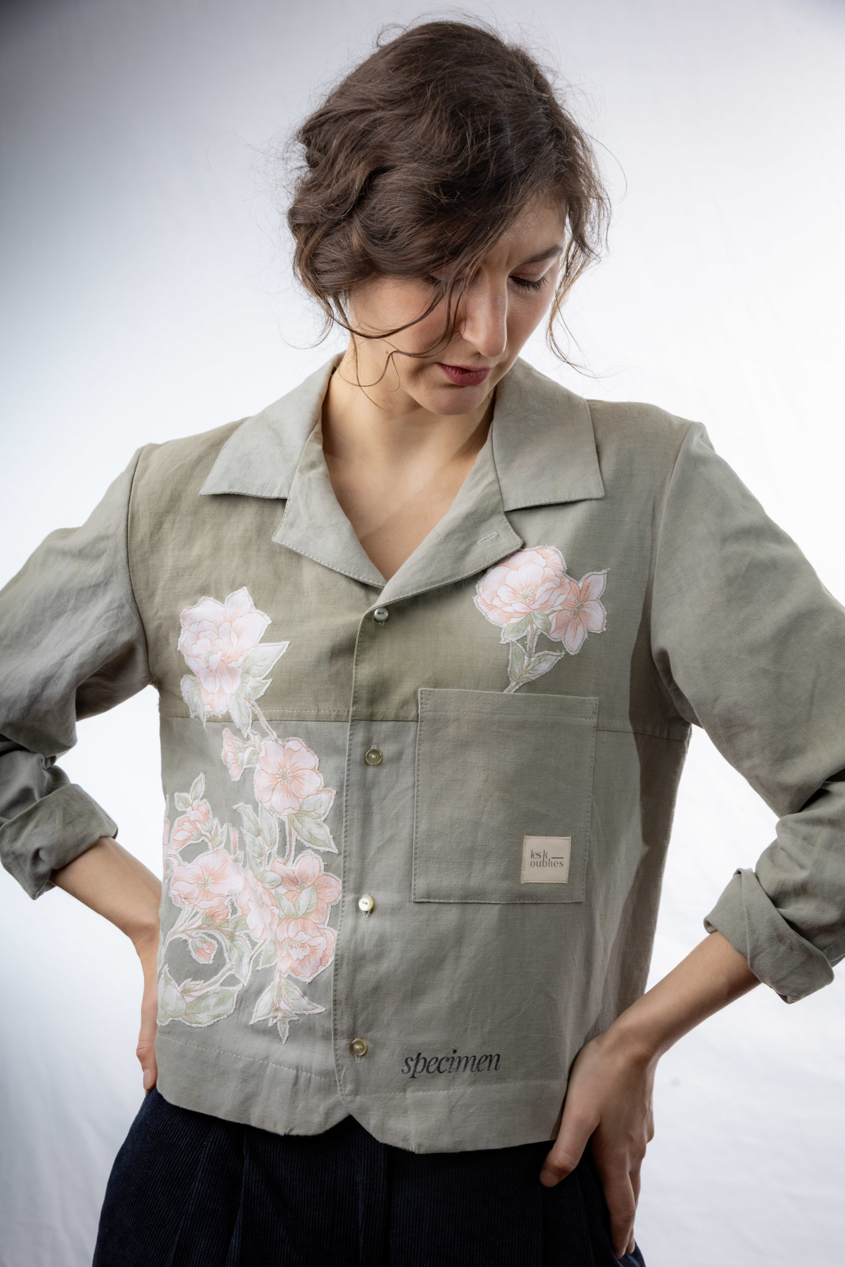 La pièce iconique PAULA arbore un col cubain et son indissociable poche plaquée. Le modèle 11.8 réinvente un drap vintage, coloré en vert, faisant ressortir différentes teintes, et donnant un effet marbré, sur lequel se pose des incrustations de chutes de tissus, pour reprendre l’esthétique d’un herbier. L’incrustation florale apporte un décalage visuel avec ses finitions brutes et effilochées, qui se peaufineront au fur et à mesure du temps.