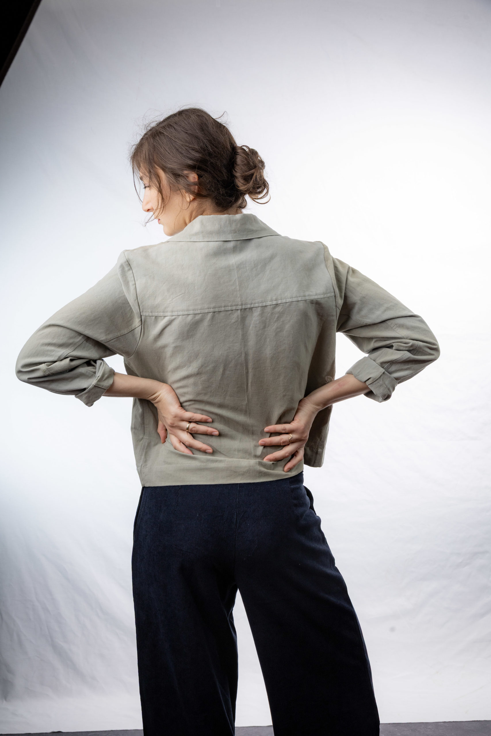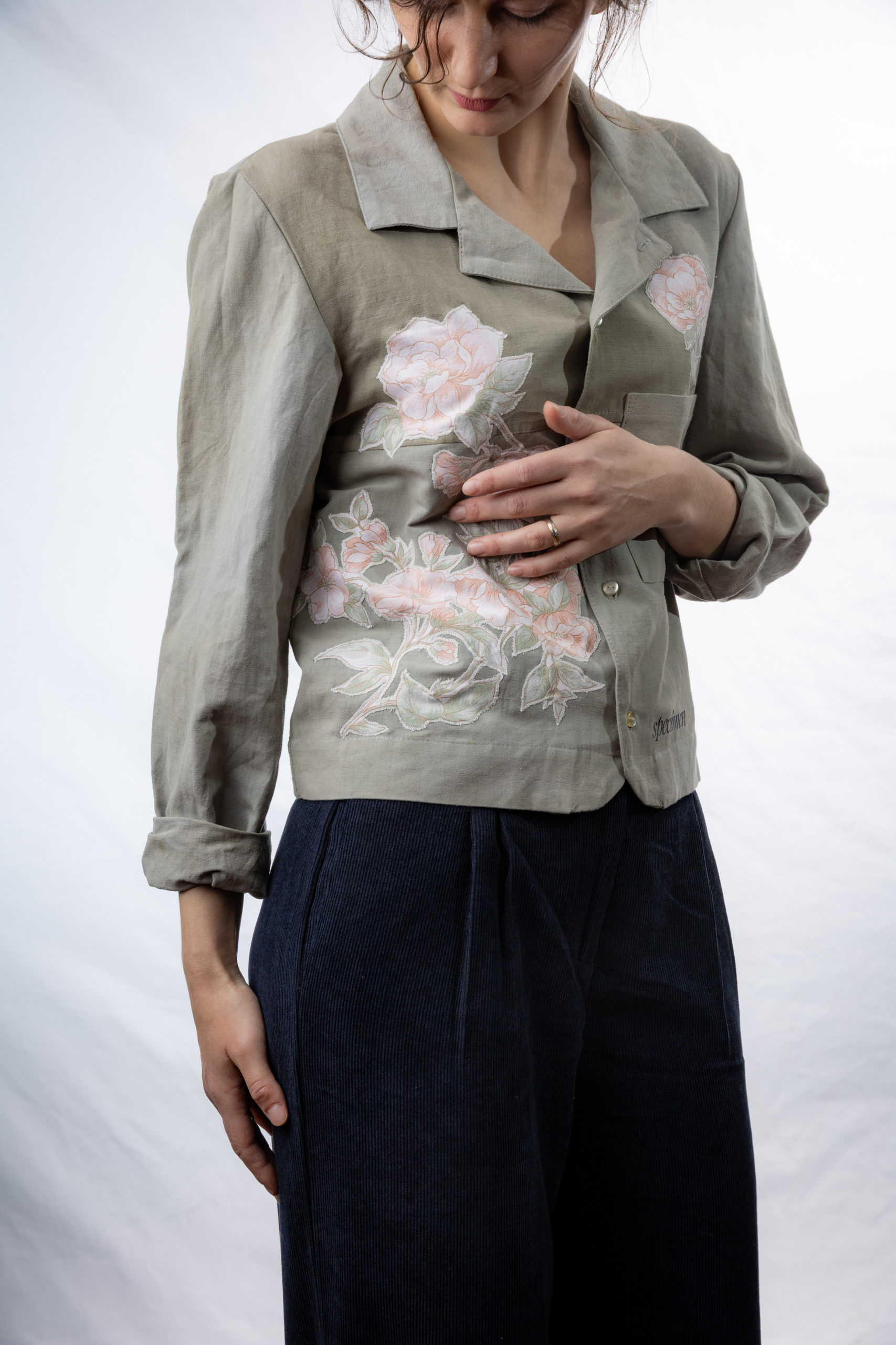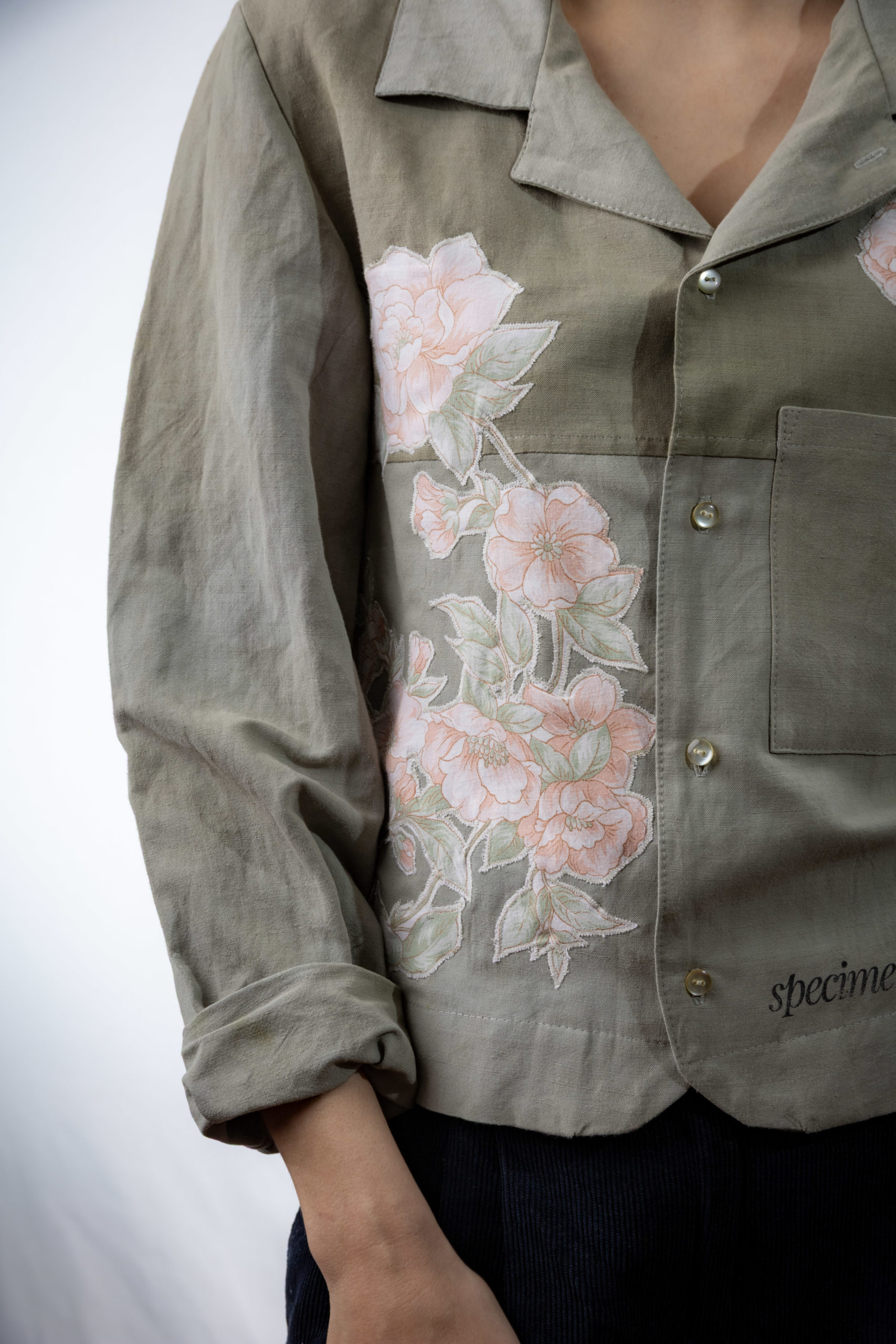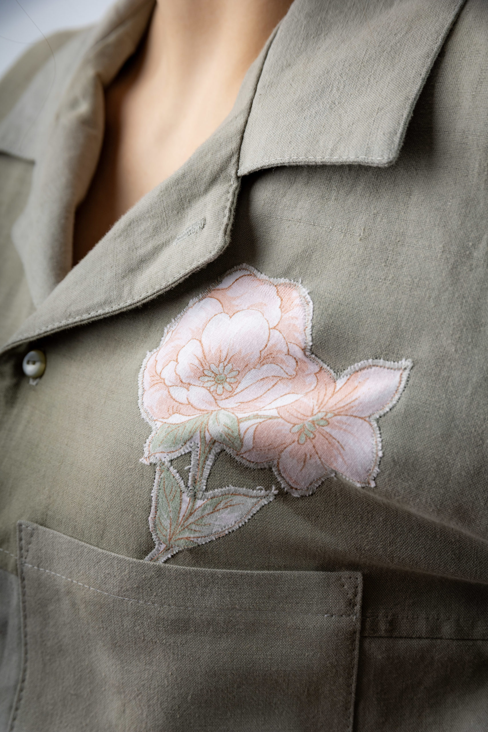La pièce iconique PAULA arbore un col cubain et son indissociable poche plaquée. Le modèle 11.8 réinvente un drap vintage, coloré en vert, faisant ressortir différentes teintes, et donnant un effet marbré, sur lequel se pose des incrustations de chutes de tissus, pour reprendre l’esthétique d’un herbier. L’incrustation florale apporte un décalage visuel avec ses finitions brutes et effilochées, qui se peaufineront au fur et à mesure du temps.